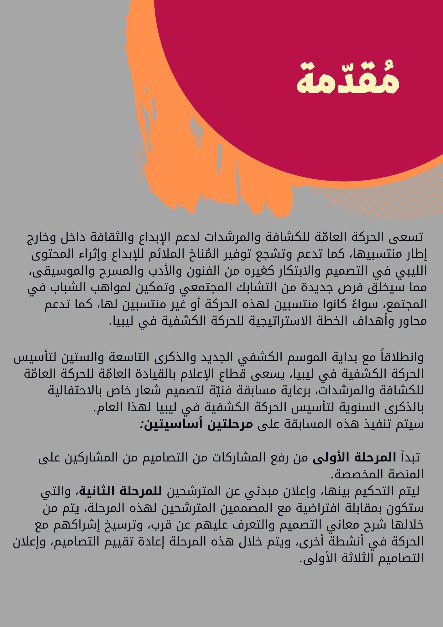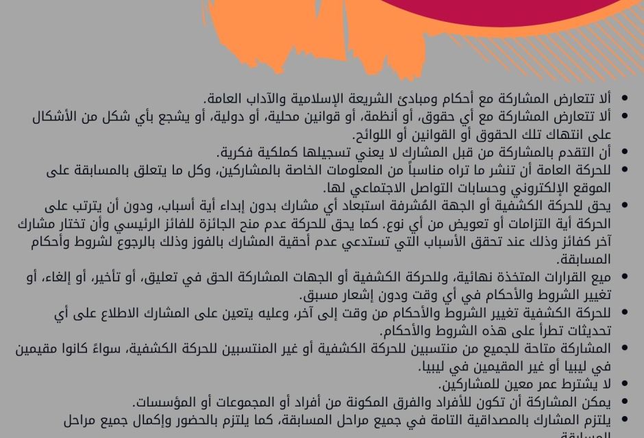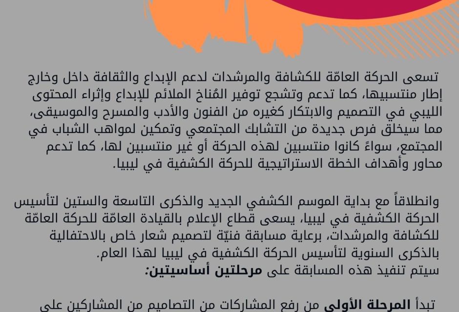 تُطلق الحركة العامة للكشافة والمرشدات مسابقة لتصميم شعار الاحتفال بالذكرى التاسعة والستين لتأسيس الحركة الكشفية في ليبيا؛ بهدف إشراك الفنانين والمحترفين من المبدعين والمصممين للتنافس على تصميم أفضل مقترح لشعار الاحتفال. وسيتم تنفيذ المسابقة على مرحلتين أساسيتين.