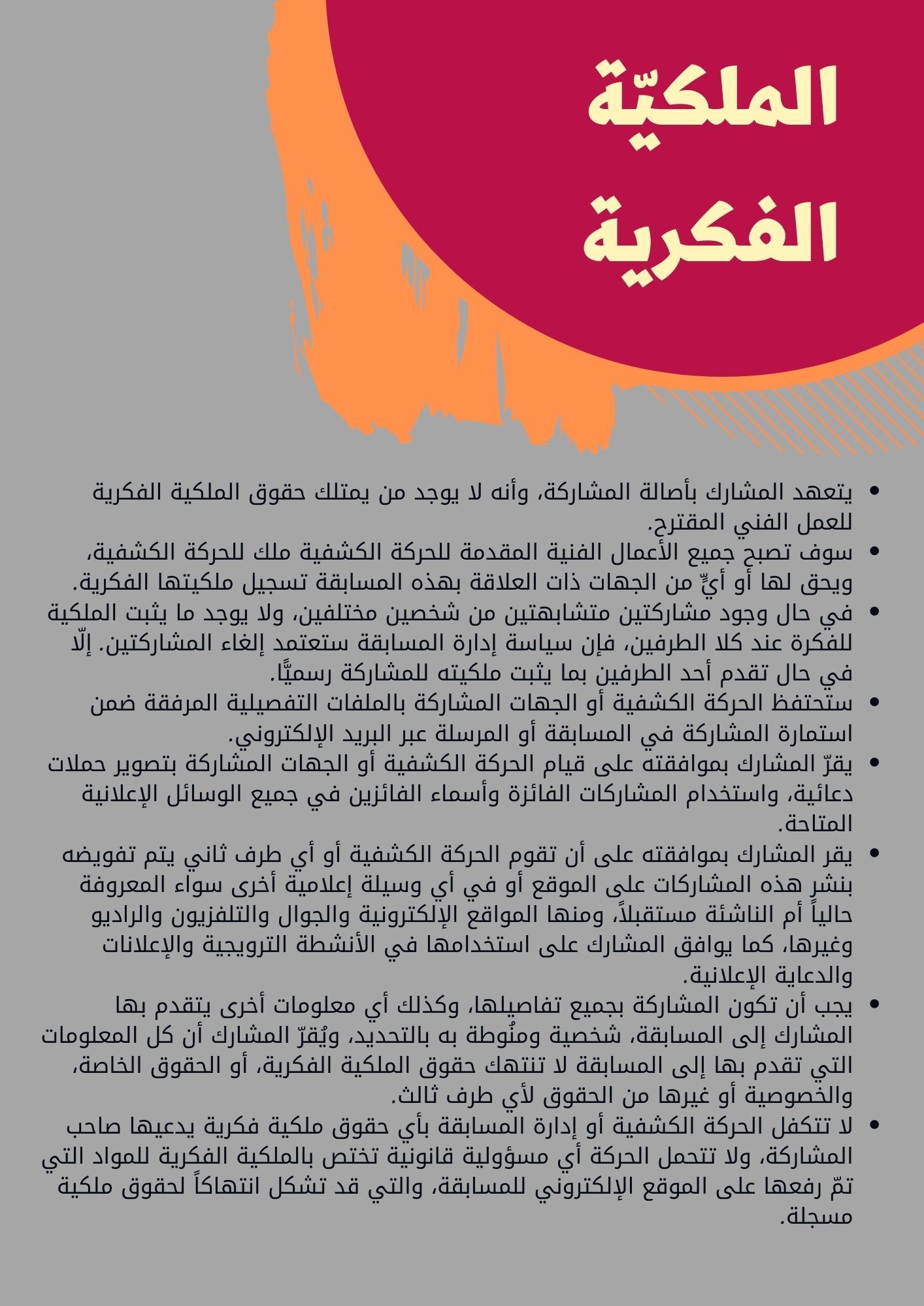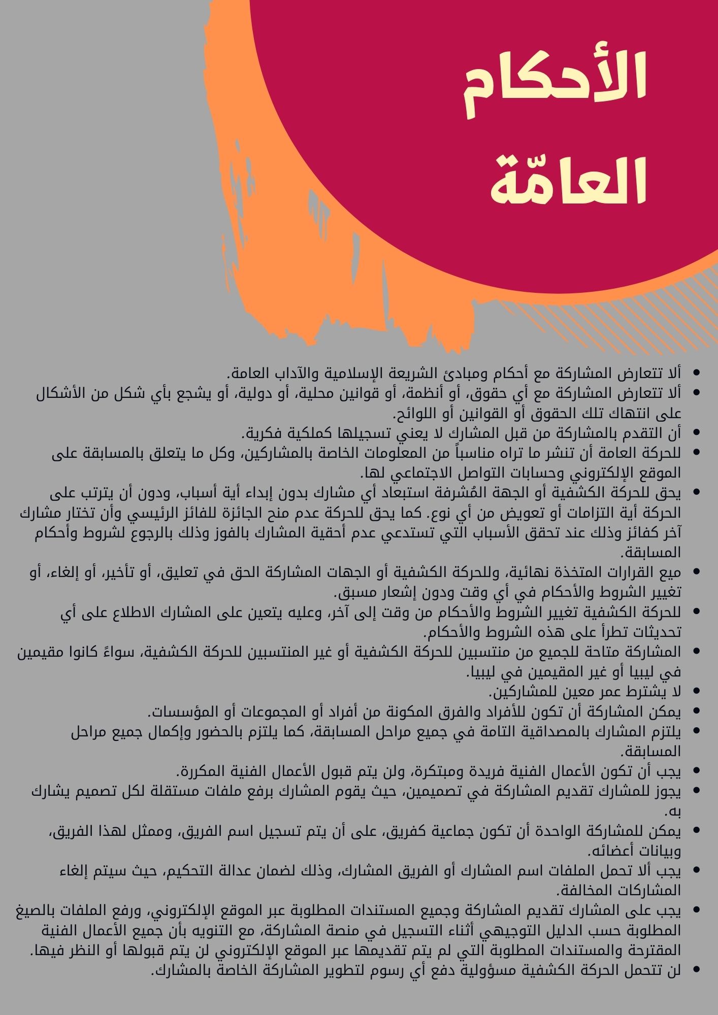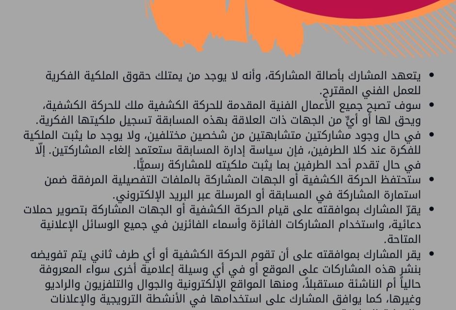 يمكنكم أيضاً الاطلاع على الشروط العامّة والفنيّة ، و الملكية الفكرية ، والمسؤولية القانونية للمسابقة ، والاطلاع على الدليل التوجيهي المرفق للمسابقة .